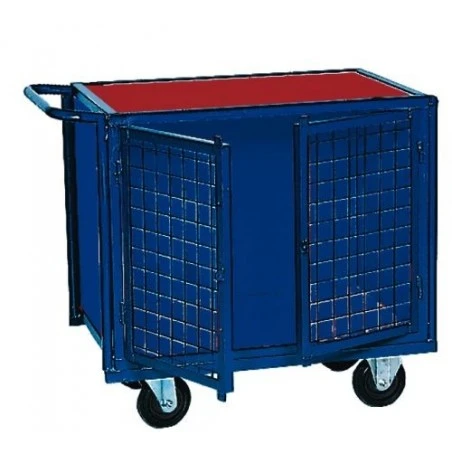 Carro portaherramientas construido en acero perfilado y tubo de acero, perfecto para utilizarse en talleres y en todo lugar donde se realicen trabajos de montaje, reparaciones, fabricación, etc. Puertas con malla de 50×50 y con ojales para introducir un candado. Superficie de fibra de madera roja. 2 ruedas giratorias con freno y dos ruedas fijas.