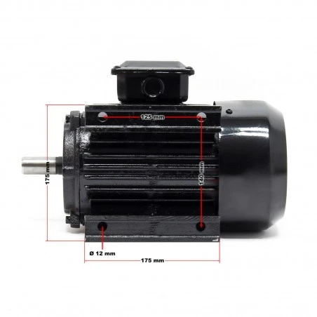 El motor eléctrico con clase de protección IP44 tiene el diseño B3 (pie) con una caja de terminales en el lateral. Es decir, el motor eléctrico va montado sobre la base a sus pies. Además, el motor está equipado con un eje de 24 x 49 mm con una altura de eje de 90 mm.