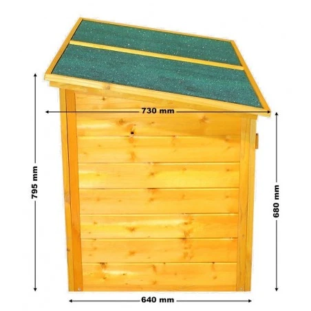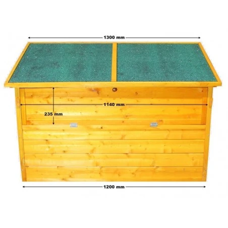 La dimensión del cofre de madera es: 128 cm de anchura x altura 77 cm x 69 cm de profundidad, la capacidad es de alrededor de 600 litros.