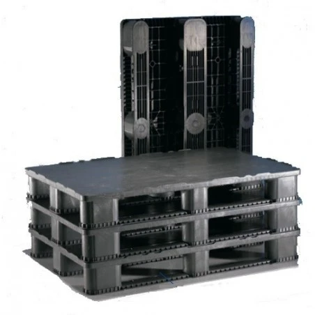 Palet con patas con la base lisa por arriba y revirada por abajo con 2 patines, fabricado en polietileno reciclado de alta densidad resistente a los rayos ultravioleta e infrarrojos, ácidos, al paso del tiempo y a altas y bajas temperaturas.