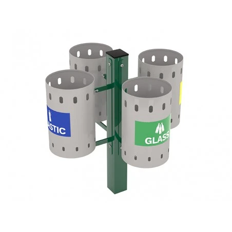 Papelera de acero dividida en cuatro secciones para la recogida selectiva de residuos. Cada papelera está equipada con una pegatina descriptiva para uso exterior, con la posibilidad de personalizar el producto para adaptarlo a los requisitos de color exigidos por la normativa sobre recogida selectiva de residuos en la zona de instalación.