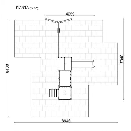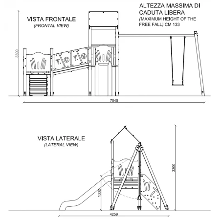 El conjunto se caracteriza por la presencia de dos torres, con plataformas colocadas a dos alturas diferentes (90 cm de alto y 120 cm de alto), conectadas entre sí por un pasaje cuesta arriba. La estructura está realizada con postes laminares de pino nórdico de 90×90 mm, cuyas esquinas son redondeadas (r. 10 mm). Está equipado con un techo de chapa perforada, plataformas y escalones de chapa gofrada para garantizar una alta resistencia al deslizamiento y balaustradas de HDPE coloreado. La torre se suministra con un tobogán recto de polietileno rotacional h 120 cm y un columpio de un asiento.