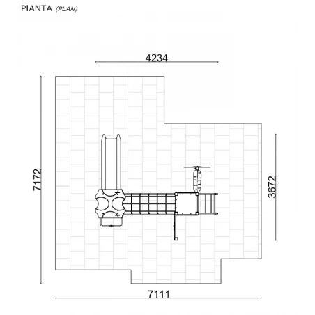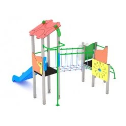 El conjunto está creado por la presencia de dos torres, con plataformas colocadas a dos alturas diferentes (90 cm de alto y 120 cm de alto), conectadas entre sí por un paso de cuerdas. Para hacer la experiencia de juego más completa, el patio de recreo se enriquece con los paneles didácticos Fiore, para aprender los nombres de los colores en dos idiomas diferentes, y Suntime, para aprender a decir la hora. La estructura está realizada con postes de aluminio de 90×90 mm, cuyas esquinas son redondeadas (r. 10 mm). Está equipado con techo, balaustradas y asiento en forma de hoja en sándwich de HDPE (espesor 15 mm) y plataformas en MDPE con una superficie en relieve, para garantizar una alta resistencia al deslizamiento. La torre está equipada con escalera y poste de bombero en acero pintado en polvo y tobogán recto en polietileno rotacional h 120 cm.
