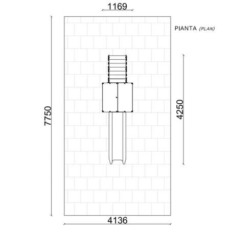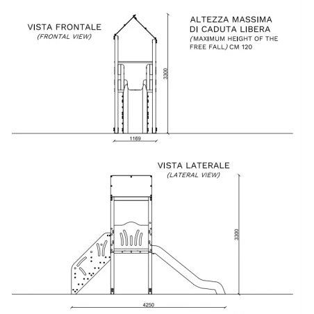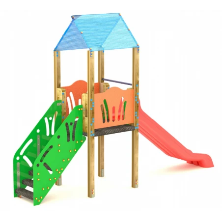 La estructura está realizada con postes laminares de pino nórdico de 90×90 mm, cuyas esquinas son redondeadas (r. 10 mm). Está equipado con un techo de chapa perforada, plataformas y escalones de chapa gofrada para garantizar una alta resistencia al deslizamiento y balaustradas de HDPE coloreado. La torre está equipada con un tobogán recto en polietileno rotacional h 120 cm.