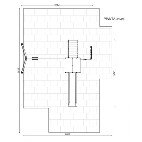 La estructura está realizada con postes laminares de pino nórdico de 90×90 mm, cuyas esquinas son redondeadas (r. 10 mm). Está equipado con un techo de chapa perforada, plataformas y escalones de chapa gofrada para garantizar una alta resistencia al deslizamiento y balaustradas de HDPE coloreado. La torre se suministra con un tobogán recto de polietileno rotacional h 150 cm y un columpio de un asiento.