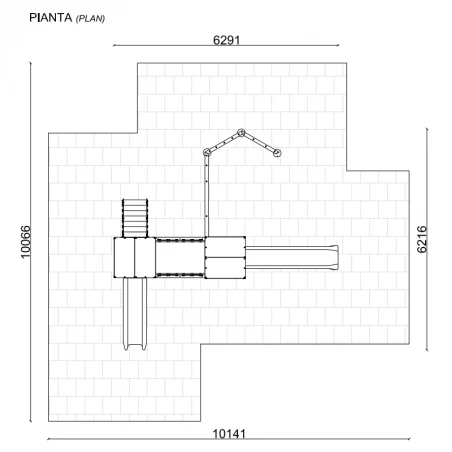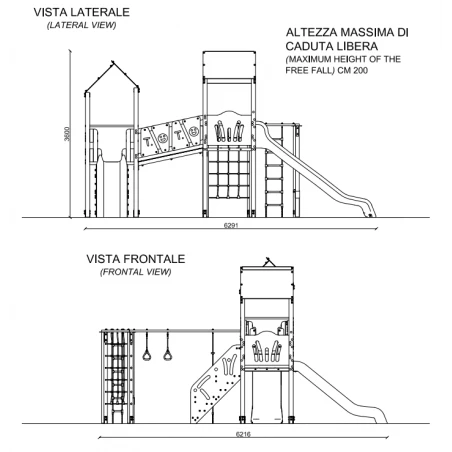 El conjunto se caracteriza por la presencia de dos torres, con plataformas colocadas a dos alturas diferentes (120 cm y 150 cm de alto), conectadas entre sí por un pasaje cuesta arriba. La estructura está realizada con postes laminares de pino nórdico de 90×90 mm, cuyas esquinas son redondeadas (r. 10 mm). Está equipado con un techo de chapa perforada, plataformas y escalones de chapa gofrada para garantizar una alta resistencia al deslizamiento y balaustradas de HDPE coloreado. La torre está equipada con dos toboganes rectos en polietileno rotacional (h 120 cm y h 150 cm) y un gimnasio equipado con cuerda, red, escalera y barra de escalada en cuerdas Erkules con núcleo de acero.