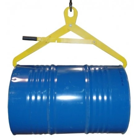 Pinza para la elevación horizontal o vertical de bidones metálicos rebordeados de 220 litros o de plástico, no mayores de 1.000 mm de altura y que no superen de 500 Kg. Sistema seguro y fiable ya que proporciona un apriete proporcional al peso elevado.