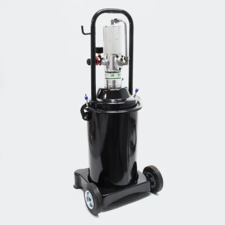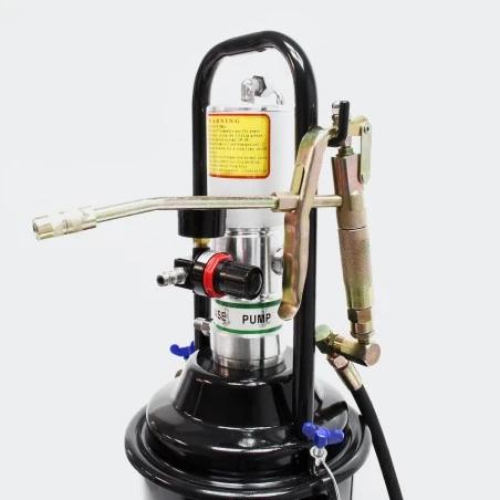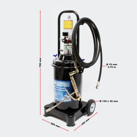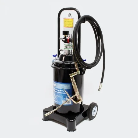 Esta pistola engrasadora profesional tiene un depósito de grasa de 12 litros. Gracias al accionamiento de aire comprimido, la lubricación con esta pistola engrasadora es aún más rápida. La pistola engrasadora trabaja con aire comprimido de 6 a 8 bar y tiene una relación de presión de 50: 1.