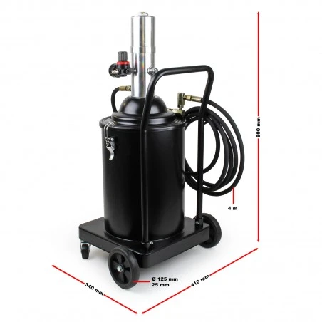 Gracias al mango y las ruedas, el dispositivo de lubricación por aire a presión es móvil. Gracias a su compacidad (91 × 40 × 39 cm) y su poco peso, la pistola engrasadora es fácil de mover y transportar. Además, el dispositivo es fácil de operar y usar. La solidez de la pistola de engrase neumática contribuye a su fiabilidad y facilidad de uso a largo plazo.