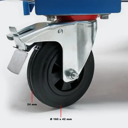 Además, el carro de transporte tiene ruedas de goma para que pueda mover cargas sin esfuerzo. El freno de estacionamiento asegura que el carro no pueda rodar cuando está completamente cargado.