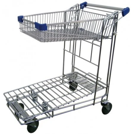 Carro encajable con varilla zincada, resistente a cargas de hasta 400Kg. Ergonomía garantizada mediante la plataforma sobreelevada para facilitar la carga y la recogida de bultos. Cuatro ruedas giratorias de goma. Cesta superior abatible.