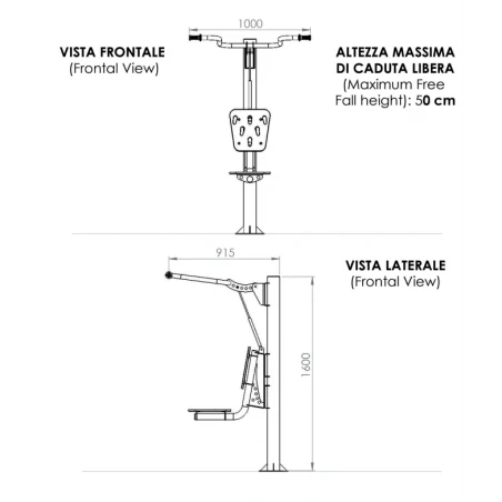 La herramienta Shoulder press permite el desarrollo de los músculos de la parte superior del cuerpo, en particular activa los músculos deltoides, los pectorales, los tríceps y el trapecio. La estructura está pintada por cataforesis y lacada en polvo.