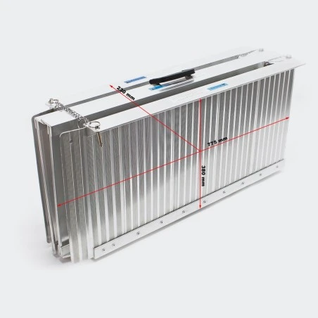 Esta práctica rampa de silla de ruedas plegable doble hecha de aluminio ligero se puede transportar fácilmente y es la ayuda móvil perfecta. Es plegable tanto en longitud como en anchura. Los escalones se unen sin ningún esfuerzo y brindan un acceso sin barreras.