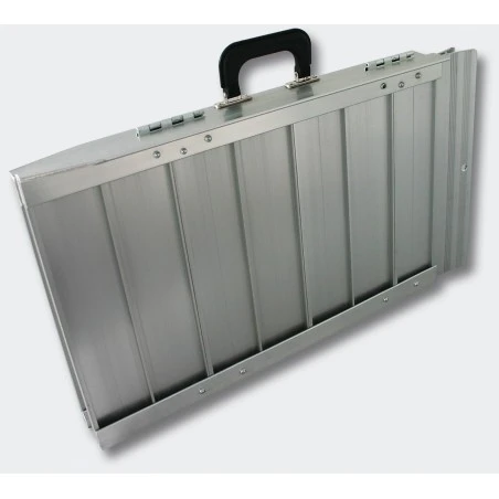 La rampa se puede plegar fácilmente haciendo uso del asa en dirección longitudinal y se transporta como una maleta utilizando el asa correspondiente que se proporciona para ello.