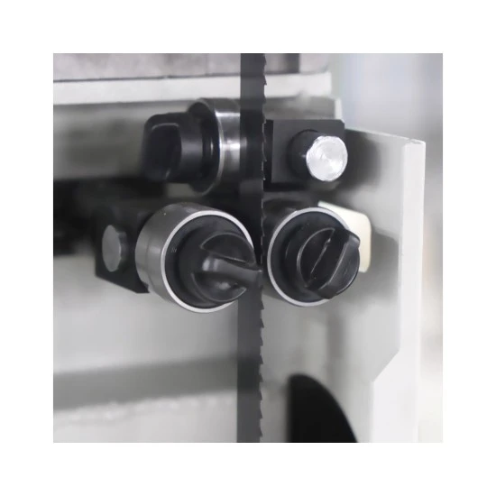 Indicador e tensión de la cinta. Guía elevable con volante. Guía de ingletes de serie.