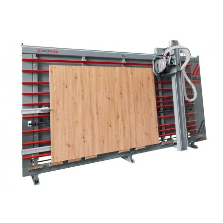 Somier de láminas ajustable manualmente para un procesamiento seguro en dirección de corte horizontal. Dos topes mecánicos para soporte de panel inferior y medio. El soporte del panel central es orientable. La unidad de corte es la sierra de incisión HOLZMANN TAS165Pro.