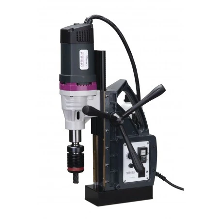 El taladro de columna DM 98 V de Optimum con base magnética, dispone de velocidad ajustable continua, alta precisión y una máxima eficiencia en la perforación de grandes diámetros.