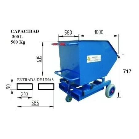 Contenedor basculante para el transporte de materiales. Chasis robusto y seguro, con tres ruedas para facilitar su transporte.